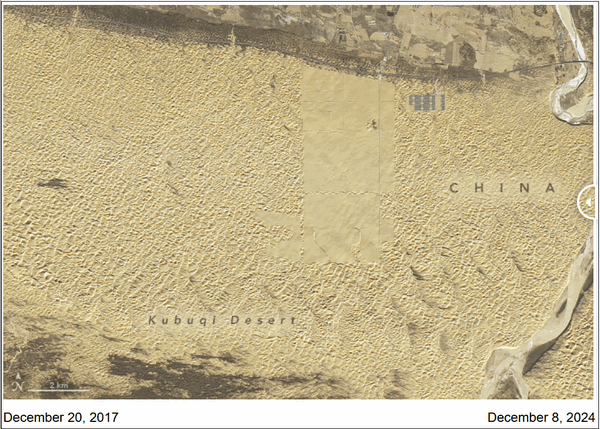 图像显示中国光伏发电项目在库布其沙漠取得重大进展:2017年12月20日还是荒凉沙漠的一隅,2024年12月8日已变身为大规模光伏发电基地。